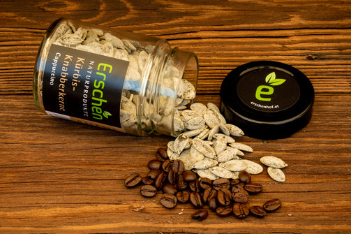 Die Kürbiskerne werden schonend geröstet und dann mit Zuckerguss mit Capuccinogeschmack überzogen. Perfekt für alle Kaffeeliebhaber!